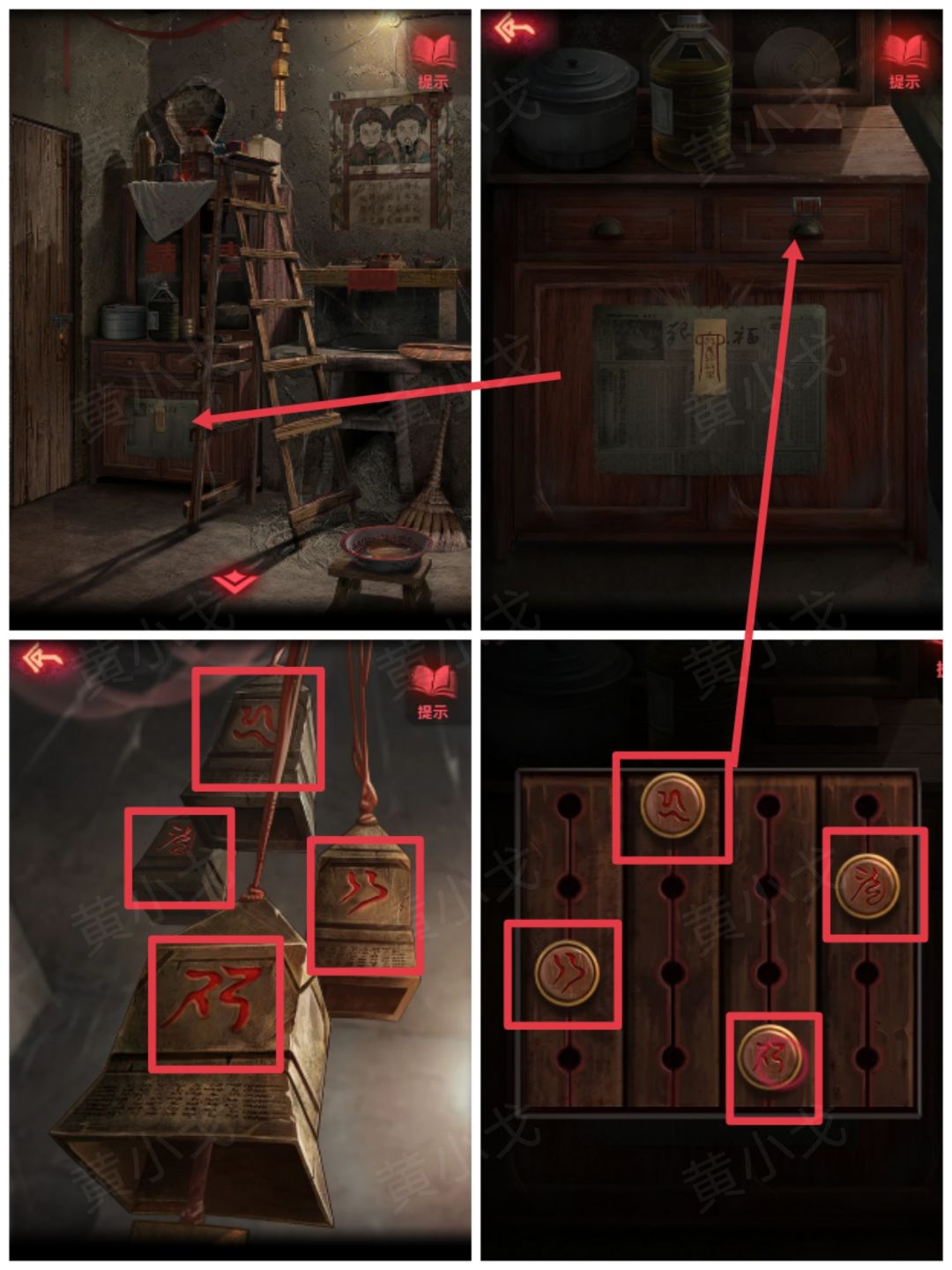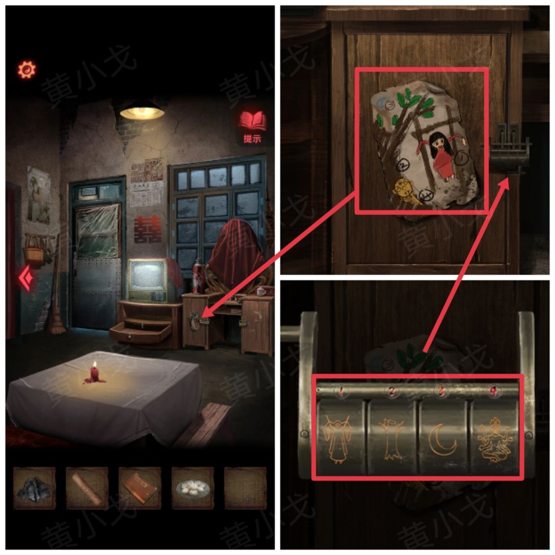12.点击梳妆台左侧柜子,根据柜门上的画,调整密码锁为:人、树、月亮、佛像