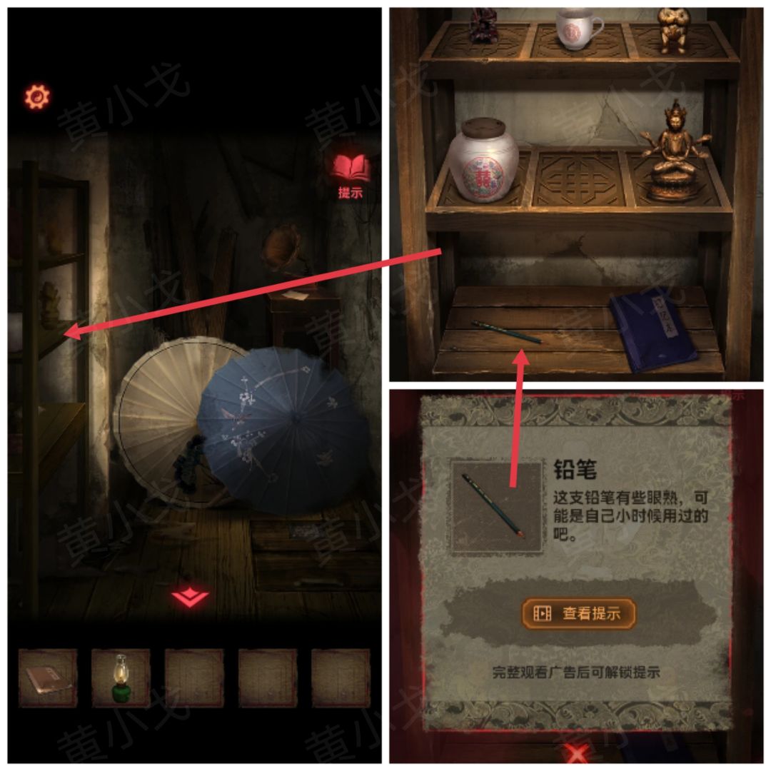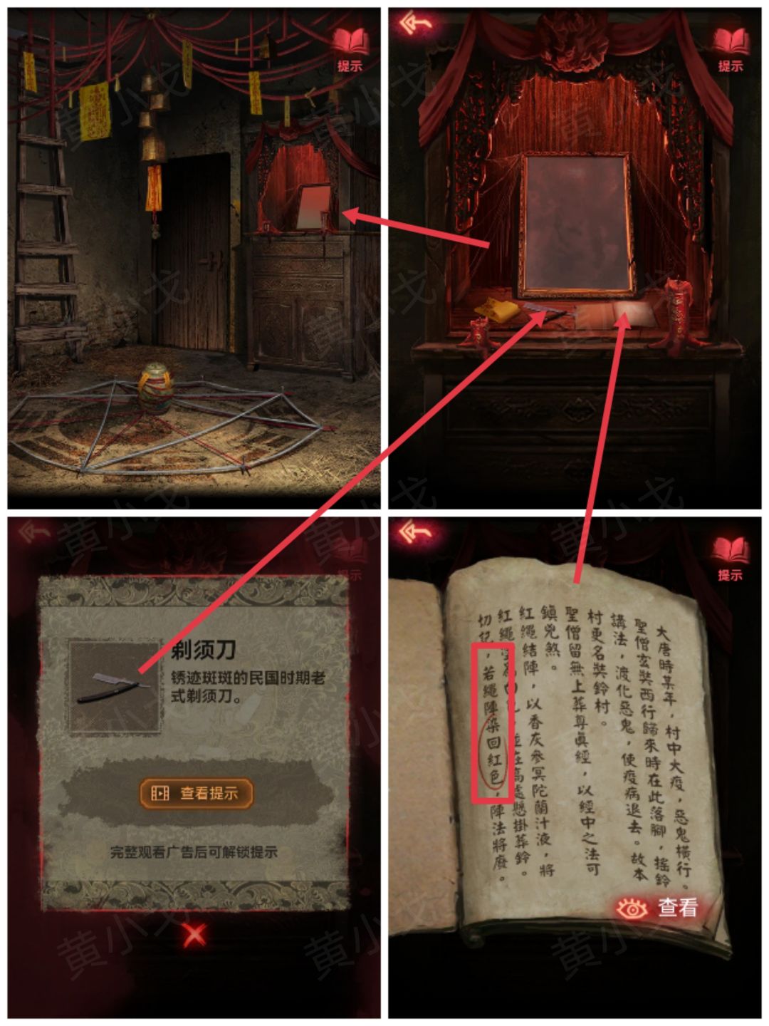 31.点击神龛,获得【剃须刀】,查看书本线索