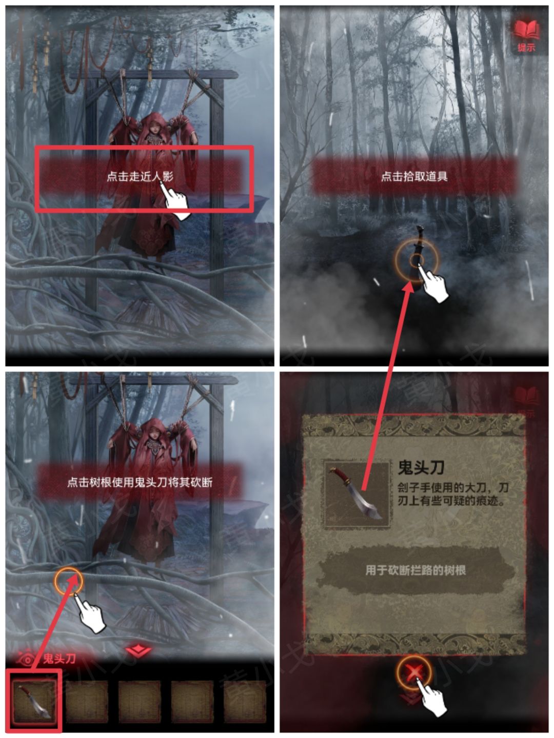 1.点击移动场景,拾取【鬼头刀】;返回,用【鬼头刀】砍断树枝,点击走进人影,触发剧情
