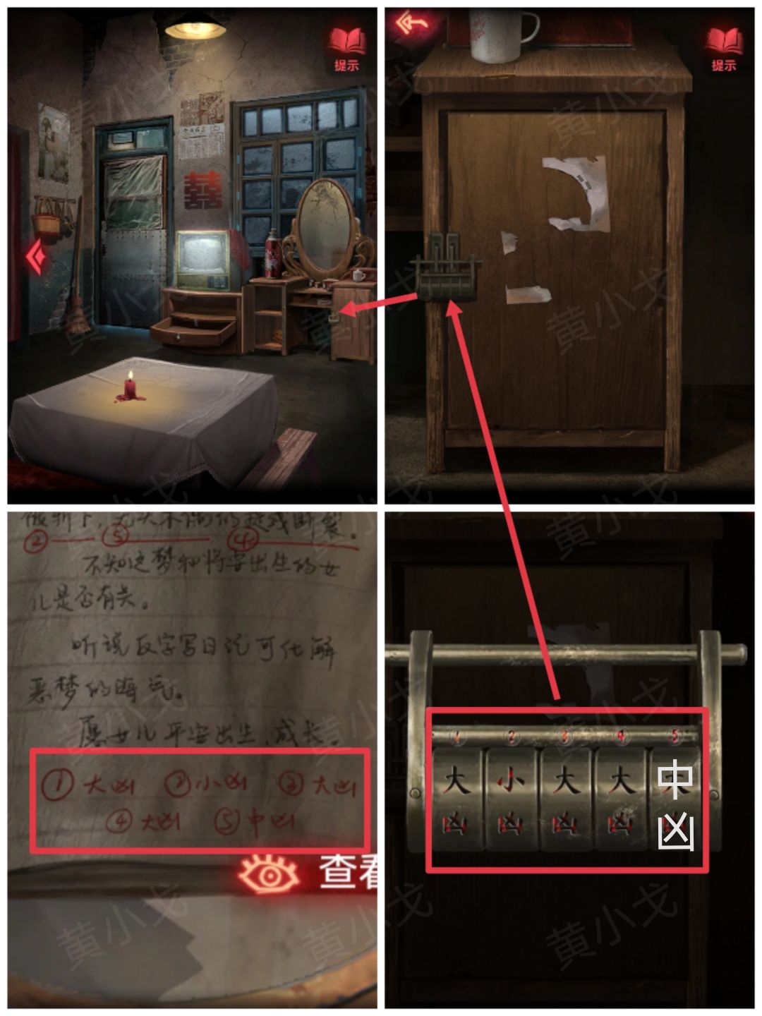 19.点击梳妆台右侧柜子,根据反字日记上的线索,结合锁上的序号提示,调整密码锁