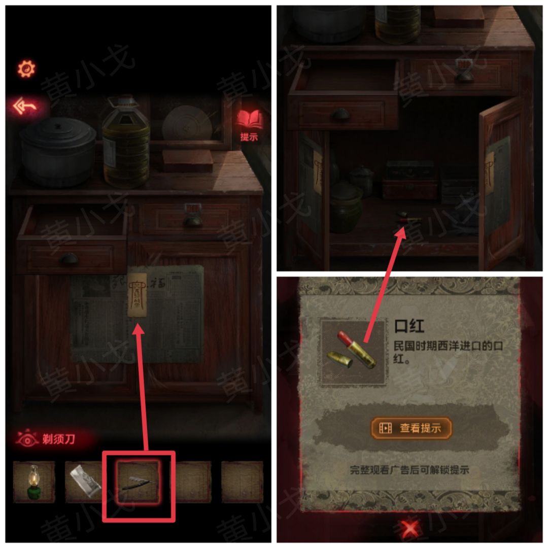 32.用【剃须刀】割开柜门上的报纸;打开柜子,获得【口红】