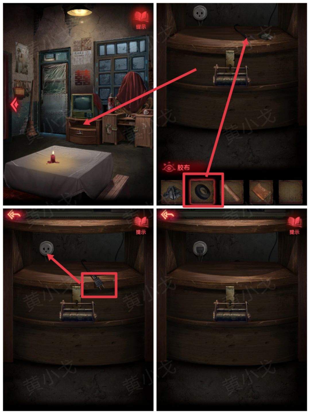 8.点击电视柜,用【胶布】粘好电源线,插上电源,电视打开