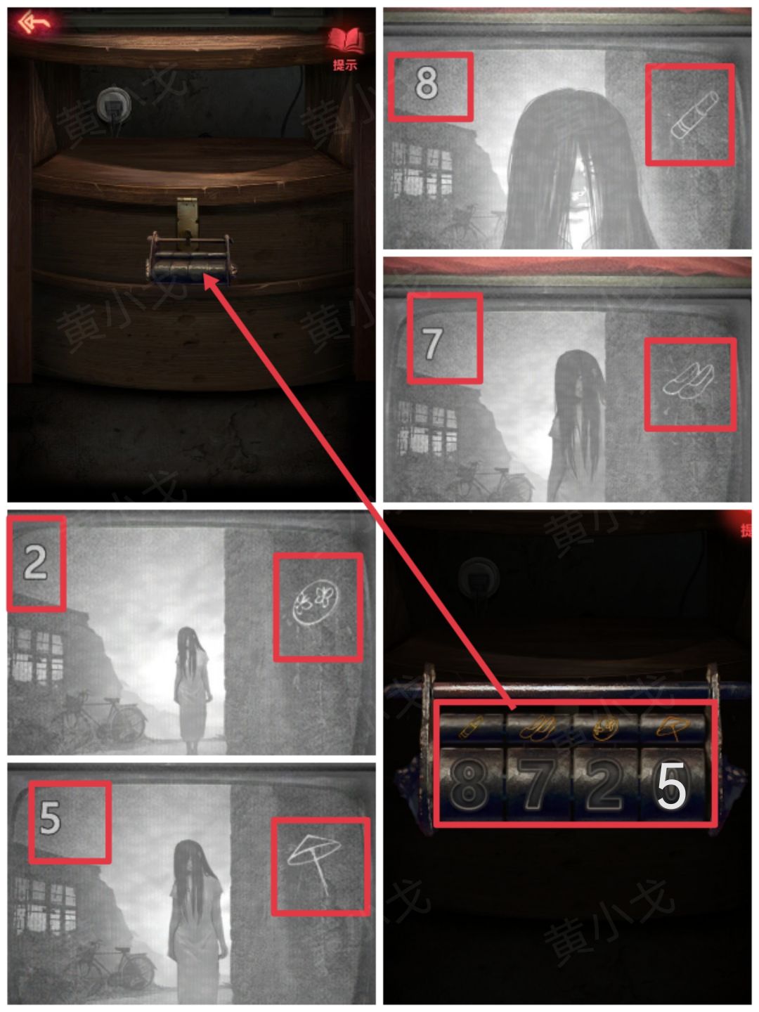 10.点击电视柜抽屉上的密码锁,根据上面的图案提示,结合电视机上的线索,输入密码:8725