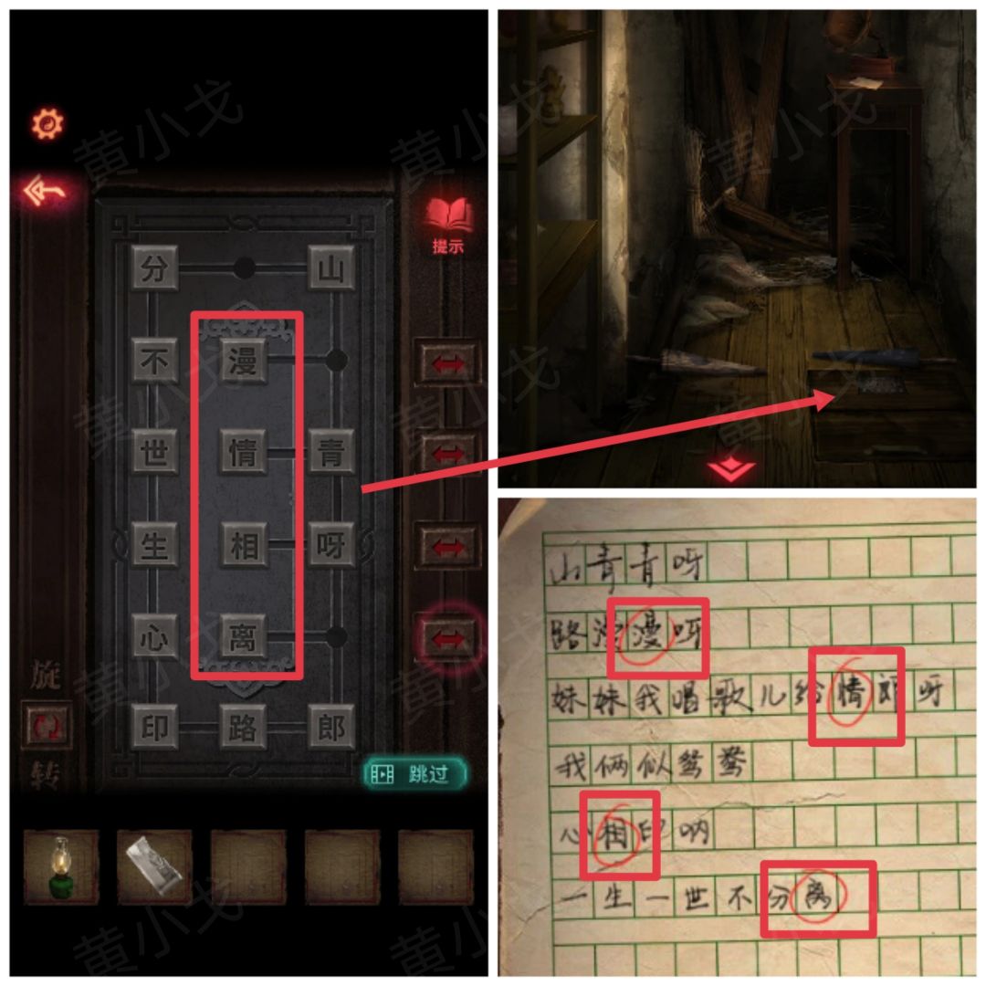 30.点击地上的暗门,根据纸上的歌词,调整密码锁;打开暗门,进入地下室