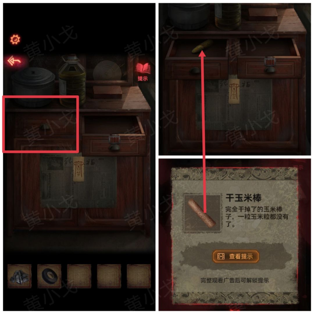 6.点击打开柜子左侧抽屉,获得【干玉米棒】