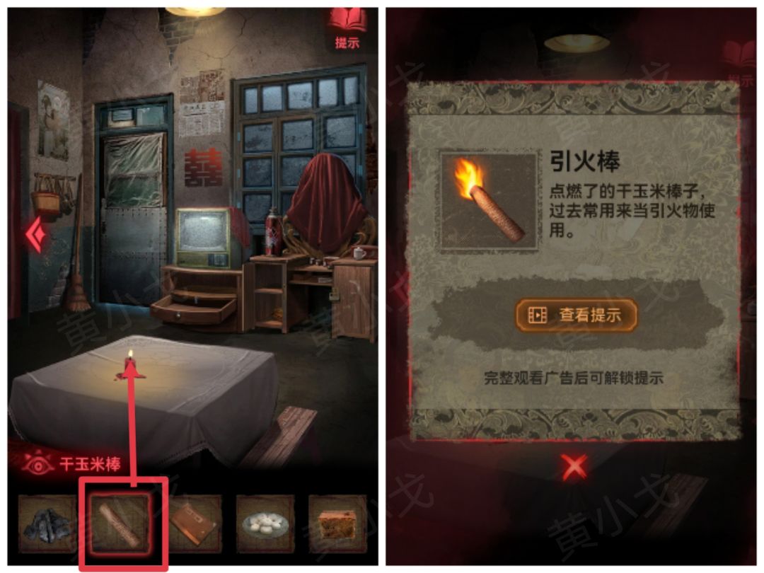 14.用餐桌上的蜡烛点燃【干玉米棒】,获得【引火棒】