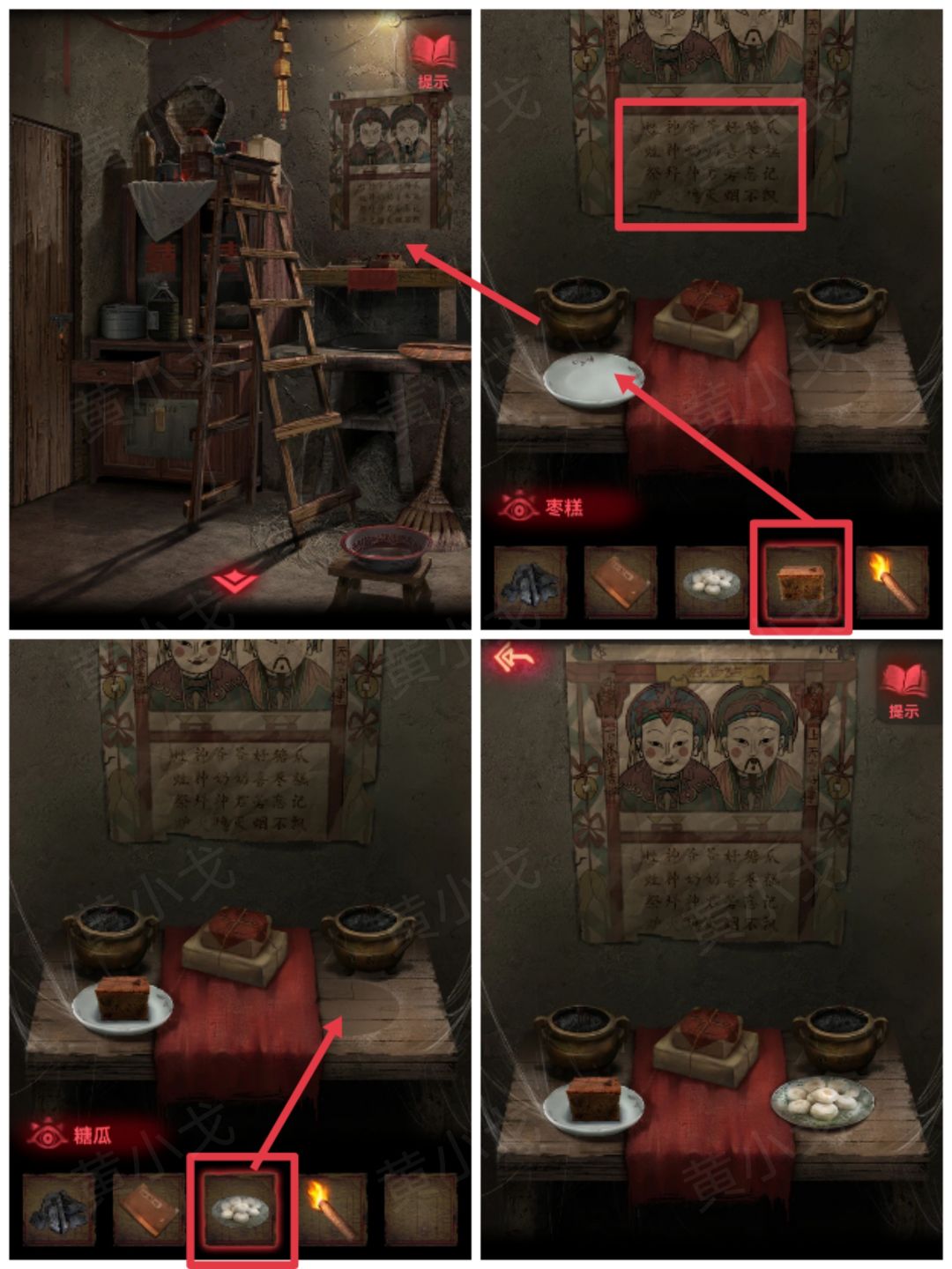 15.点击供桌,根据灶神像上的打油诗,把【枣糕】放到供盘上,再放上【糖瓜】