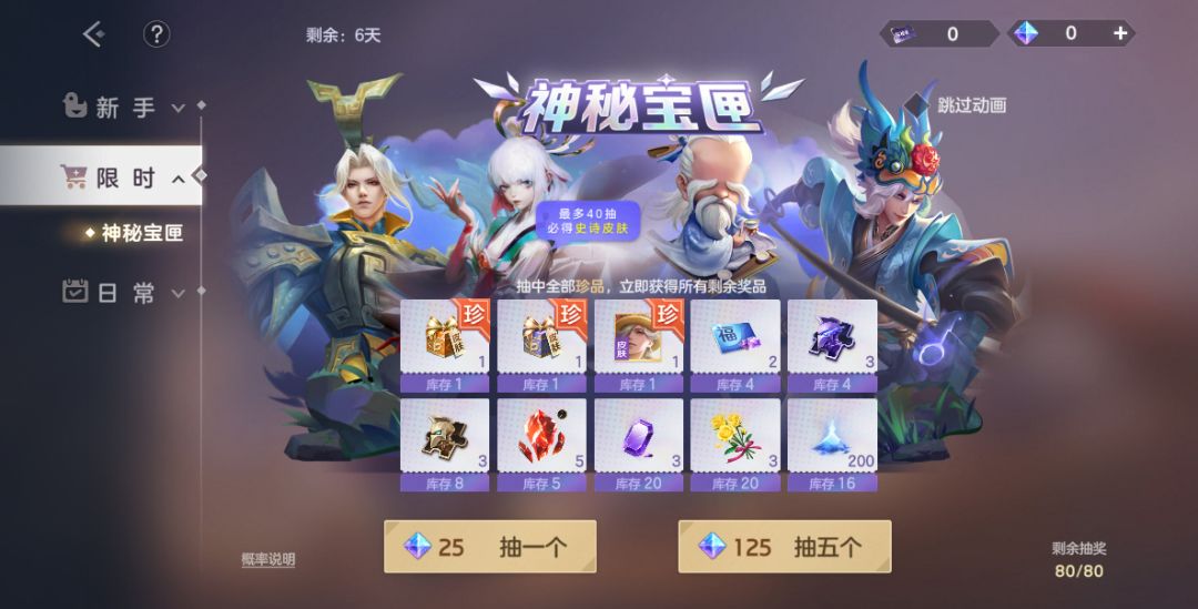 使用宝匣探秘券/龙晶进行抽奖,珍品奖励传说皮肤自选箱、宝匣史诗皮肤自选箱、梅林·秘境寻踪,高级奖励赤焰灵玉、皮肤碎片、英雄碎片、钻石祈福卡等你来抽!最多10抽必得梅林·秘境寻踪,抽完所有珍品奖励可直接获取剩余所有奖励。