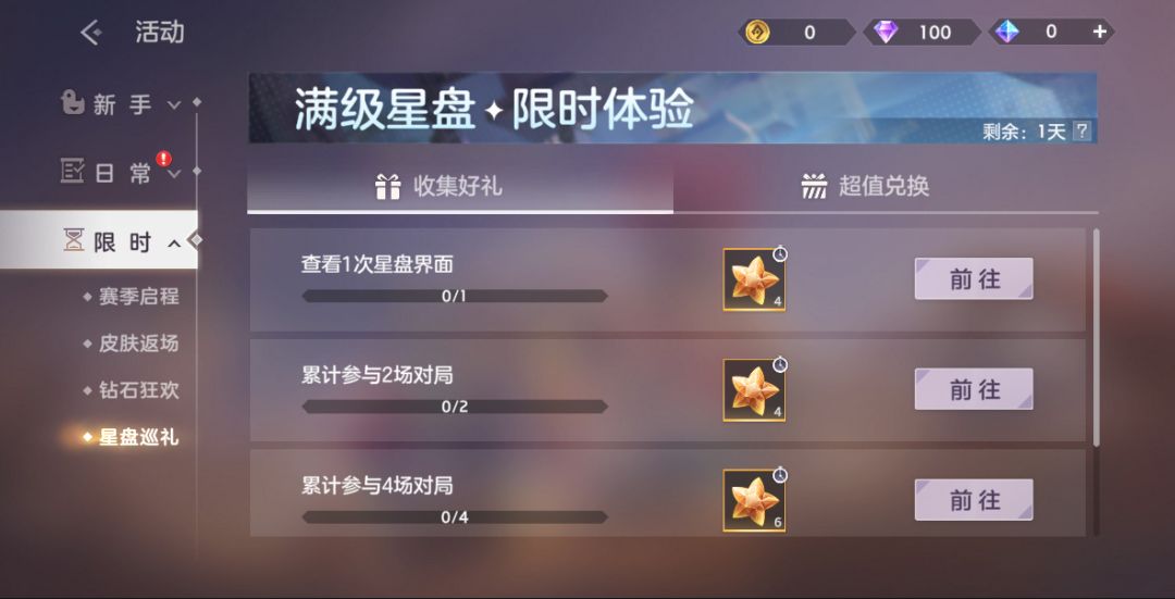 完成任务可获得星盘之星,即可兑换3天满级星盘特权卡、高级星砂、星砂、精致手信礼包等好礼。