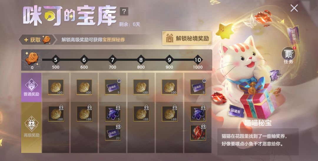 完成任务提升等级可免费获得宝匣探秘券*10(用于参与神秘宝匣活动)、金币。付费30元可以获得宝匣探秘券*30、赤焰灵玉*15、皮肤碎片*10,付费98元可以额外获得宝匣探秘券*40、赤焰灵玉*60等奖励。
