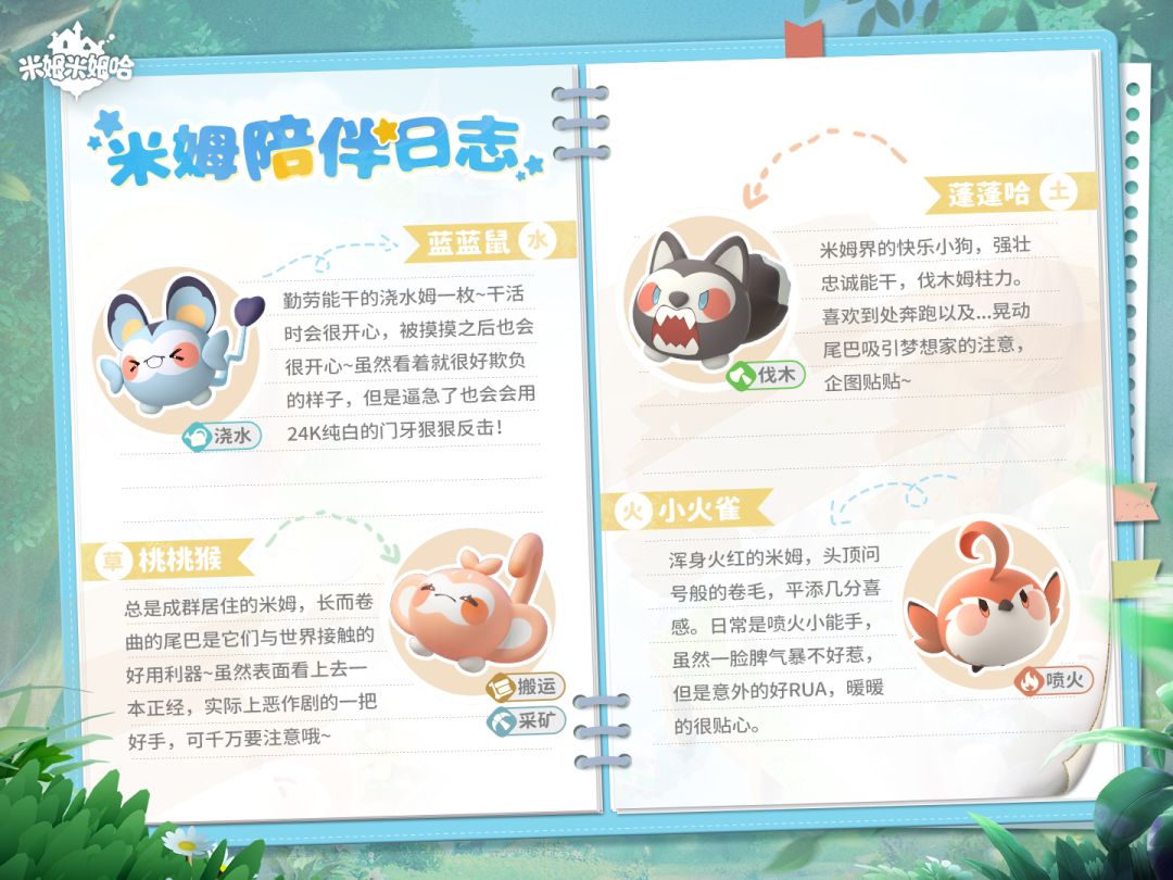 作为梦想家最要好的伙伴,浮空岛知名陪伴搭子——米姆,以团子般好rua又圆乎乎的外表、自带“草木水火土”等不同属性,出现在浮空岛的各个角落,维系着岛屿生态。