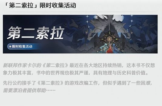 就在前几天,鸣潮发了一坨视频,没错,真是一坨,视频名字就叫《第二索拉》内测一周年PV首曝,当我第一眼看到的时候还寻思这二创做的好精细啊,坨坨今汐可爱捏~不对,真是官方?!大伙可能忘记了这个《第二索拉》,在去年的活动任务中,第二索拉是作家卡尔的小说,先行公约打算将小说其改编成游戏,想不到吧,大伙都觉得只是个胡诌的活动背景,这时隔大半年的回旋镖就这么突然飞回来拍我脑袋上了,这坑填的太哈人了,所以什么时候给咱卡卡罗填个坑?