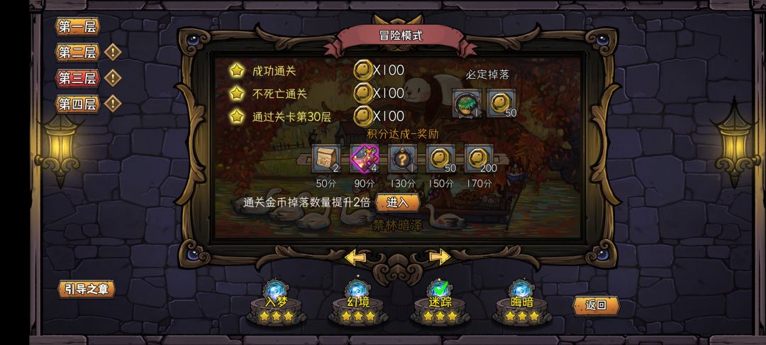 关卡分为1-4层,入梦,环境,迷踪,晦暗