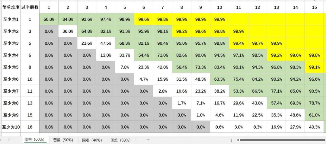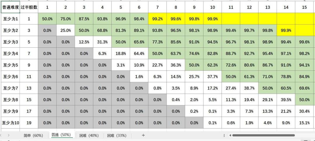 表格解释:- 过半骰数:要满足成功面至少若干个时,期望概率大于等于50%所至少需要的骰子数量;