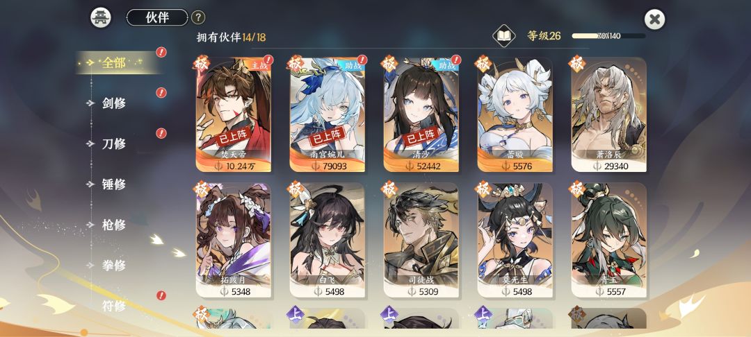 第一天按照我这么玩可以到金丹初期七-八左右,锁妖塔能打200层左右,如果你是欧皇可以打更高层 ,这里我好几个侠客都用过,感觉还是焚天帝最好用,特别是打塔那种大主怪关,