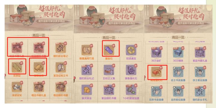 1. 红色/橙色/紫色书籍:是提升僚属战力的关键道具,无论自选还是随机,有折扣时必买,即使无折扣也建议购买。