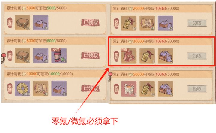 • 止损策略:如果元宝不足3w,无法拿到3w档奖励时,只购买最迫切需要的道具,将元宝留存到下一次活动。
