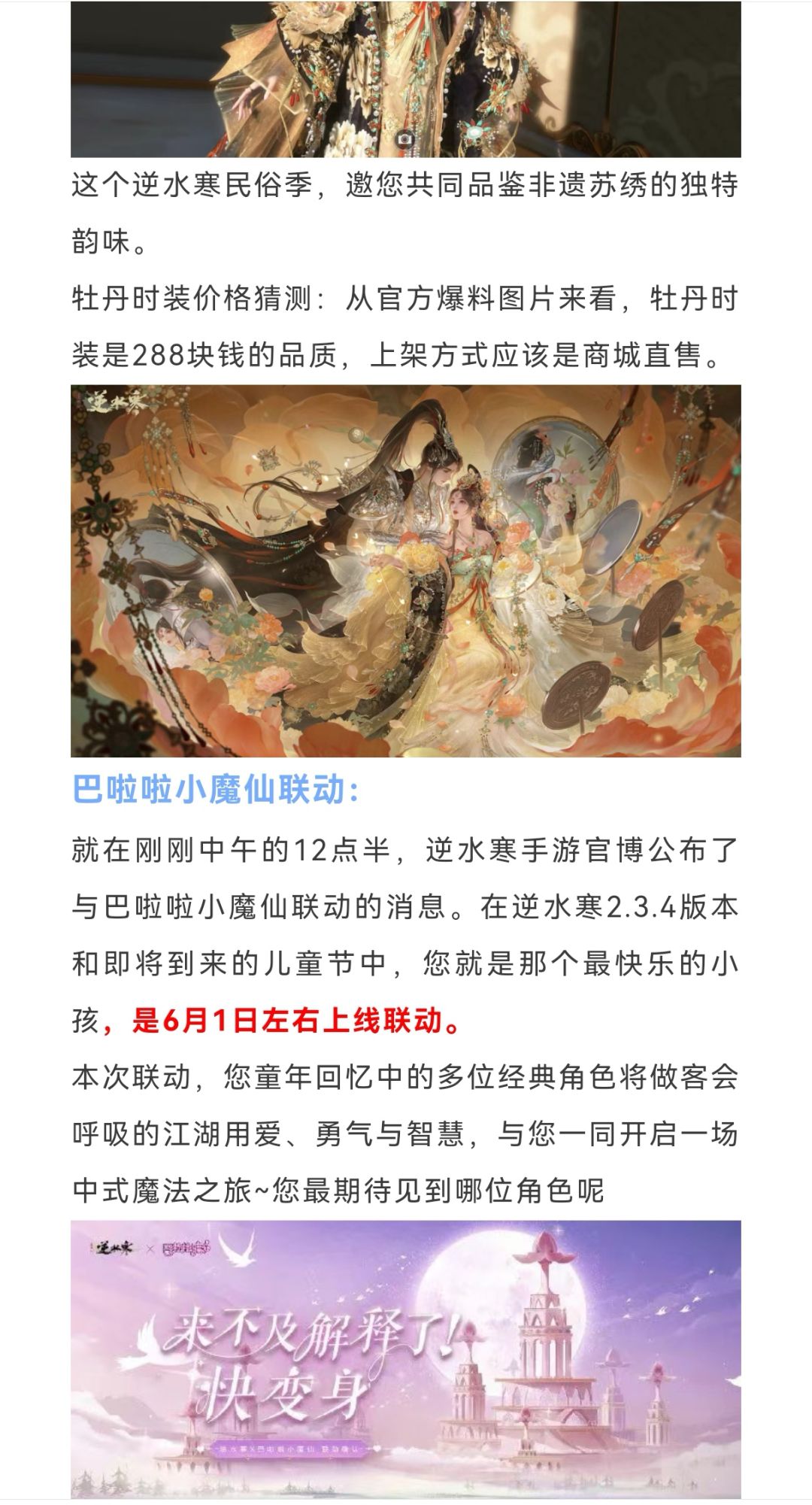 逆水寒全新牡丹主题时装爆料,商城直售288块,巴啦啦小魔仙联动,明天开启【流派首席】竞选