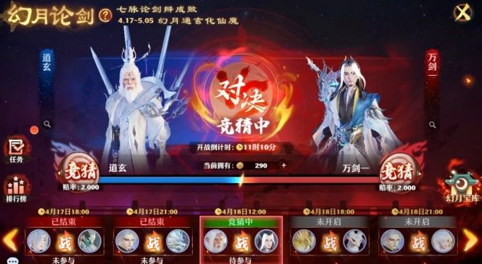 趣味竞猜玩法「幻月论剑」上线。在「幻月论剑」中,每天会有三场论剑,两边的论剑选手是来自神州浩土的各位妖王、剑灵、仙尊等等。