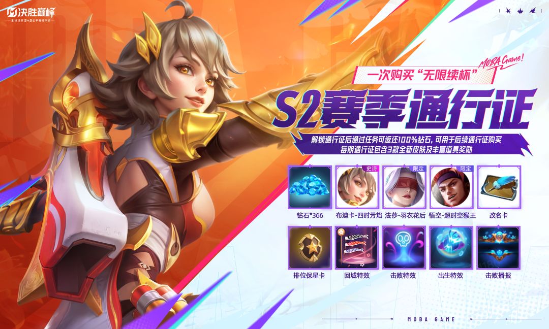 ①366钻石购买S2赛季通行证,1级即可解锁布迪卡全新史诗限定皮肤「四时芳焰」,更有悟空「超时空猴王」、法莎「羽衣花后」、战场播报、回城特效、击败特效、出生特效、改名卡等丰富道具奖励等你带走~