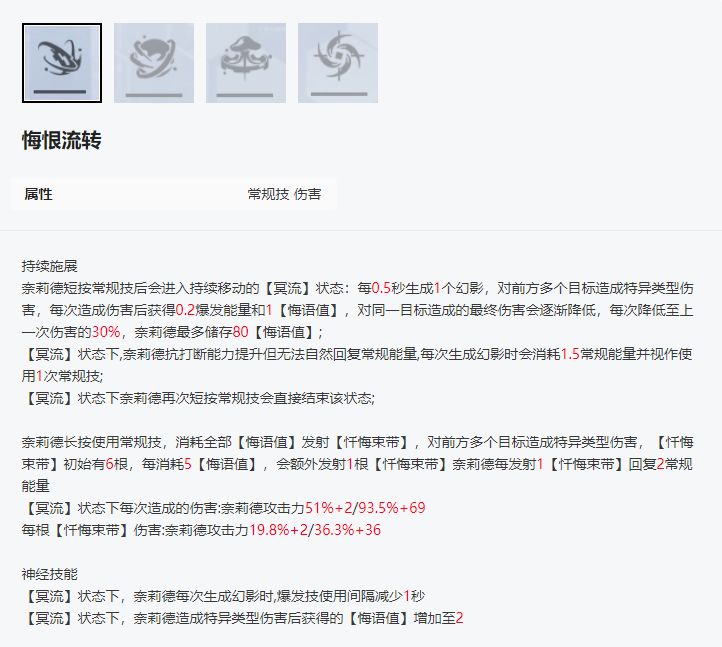 按一下e后进入幻影移动状态,可以持续向前方敌人自动攻击,提升爆发能量以及积攒【悔悟值】,不过伤害会逐步降低,并持续消耗能量。【悔悟值】在屏幕下方以4格红色能量进行显示。长按后会清空【悔悟值】结算一次攻击,用于收尾爆发和回收能量。神经技能的机制都很重要。额外值得一提的是她的闪避也是特殊闪避,和凯姐的信息态类似,闪避也可以打断常规技。