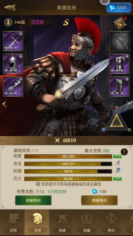 橙色突破红色需要兵符最大值3600。个人觉得有点奢侈了,意义不大,不建议白嫖玩家去突破。武将使用:对于新区玩家来说,拥有一个汉尼拔武将,不管是战役,远征,国战还是城战,都是一个性价比特别高的武将。获取难度低,获取时间早。开区第一天就可以获得,之后就给他特训满,对比贞德需要抽转盘,要很多砖石,奥古斯都需要贵6等级要简单的多。因为汉尼拔是个技能武将,在城战中伤害比较稳定,所以在游戏中期我们可以给他上破甲装备。我们可以利用他的开场技能伤害,和破甲属性来打伤害。