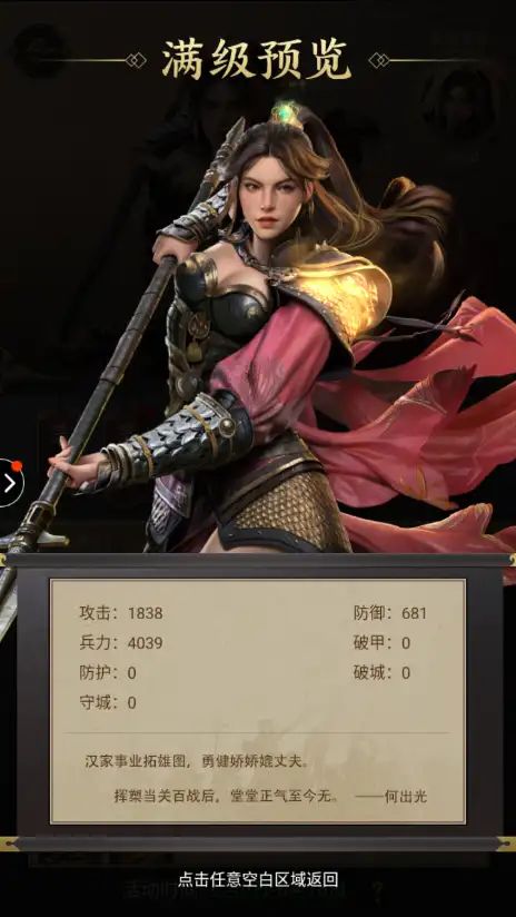 武将最大资质:368攻击成长资质:11.1 防御成长资质:5.5 兵力成长资质:32.8武将运用:由于花木兰不是技能武将,面板又不高。几乎很少有人使用,大部分都是用作采集,和一些辅助任务。