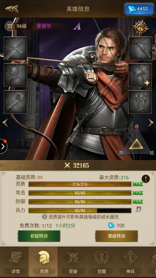 基础资质:99 最大资质:264攻击成长值:5.7 防御成长值:6.9 兵力成长值:18.2橙色武将突破到红色武将就有点浪费了,需要最大兵符数量3600个,红色武将数据如下。