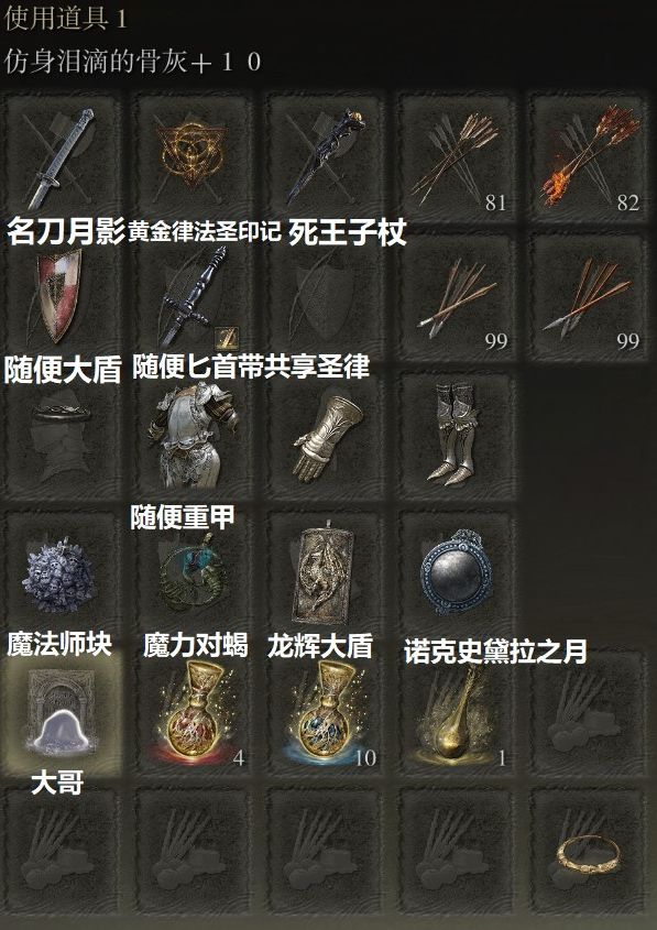 月光剑不是必带的。如果主武器是亵渎大剑的话,巨人火焰也可以下了。