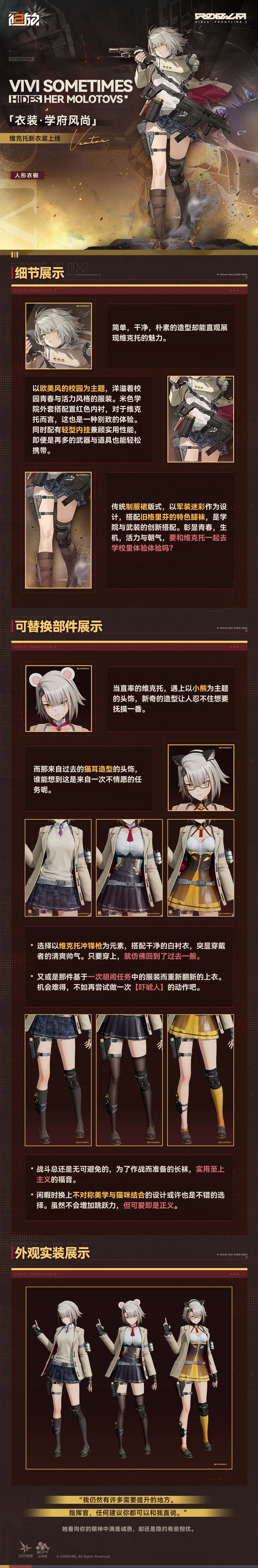 维克托<衣装·学府风尚>4月15日维护后~5月6日维护前 限时折扣上架。一套学院风格服饰。外套选用了沉稳低调的色系,搭配别具巧思的深蓝色裙装,在保持书卷气的同时,突显少女行事的利落感。