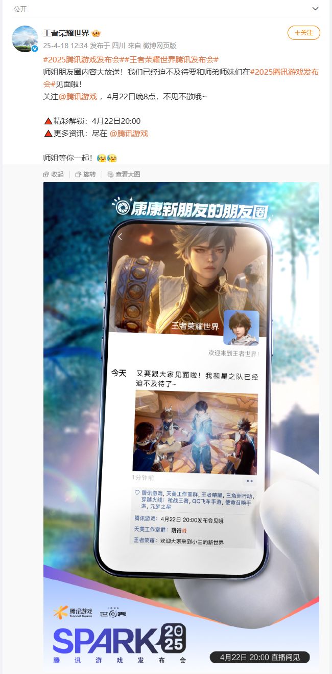 ✅腾讯旗下天美工作室的新作《王者荣耀:世界》将会在2025腾讯游戏发布会上与大家见面。「2025腾讯游戏发布会」将于4月22日晚20点开启,