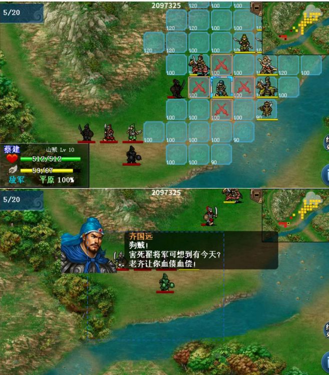 地图正上方会出现多批敌军,最后还有主将率军出现,需要全灭。