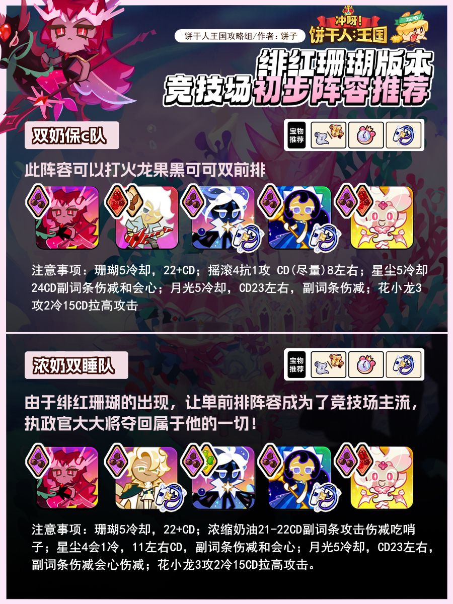 绯红珊瑚版本竞技场初步推荐,目前主流队伍均围绕绯红珊瑚搭配,也得益于单前排的特性,浓缩奶油又有了上场的空间,目前珊瑚队还不完善,上赛季的双前排队仍有登场机会,等30号更新实证战场后阵容还会再调整。
