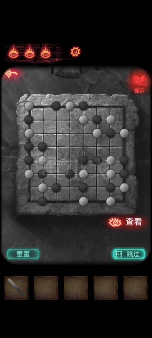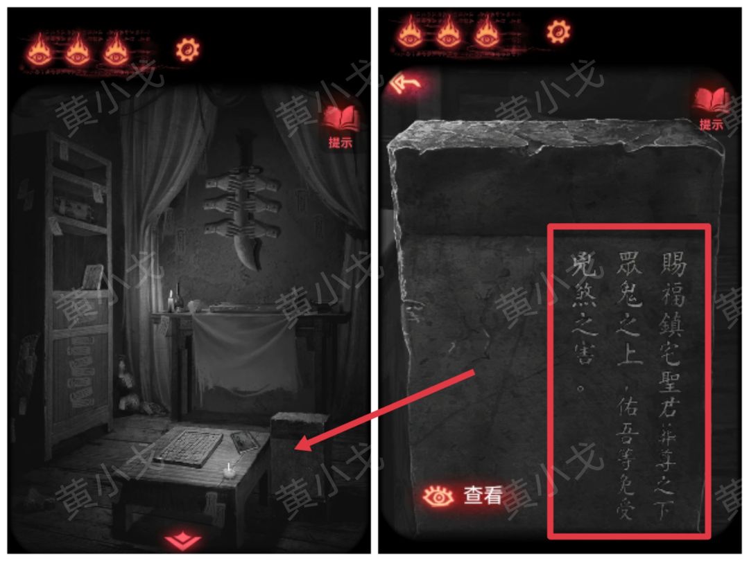 21.点击忌物阁的门,把三颗【宝石】放入浮雕眼睛的凹槽中,打开门