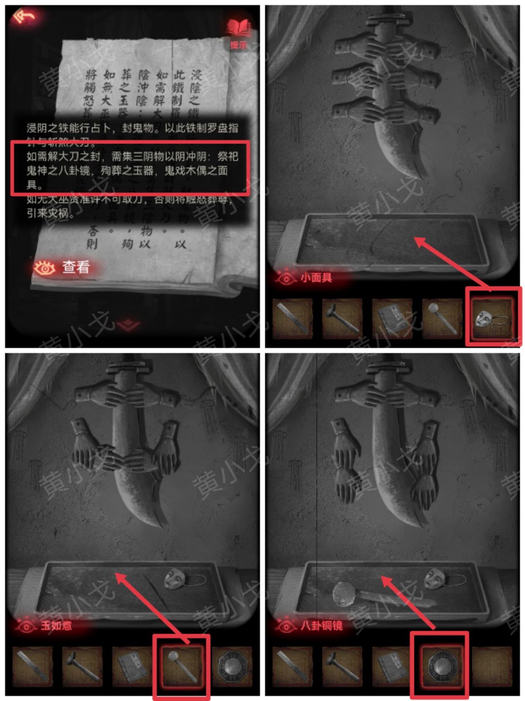 16.根据石壁上的线索和【笔记本】上的线索,调整正确的字;打开屋顶,获得【玉如意】