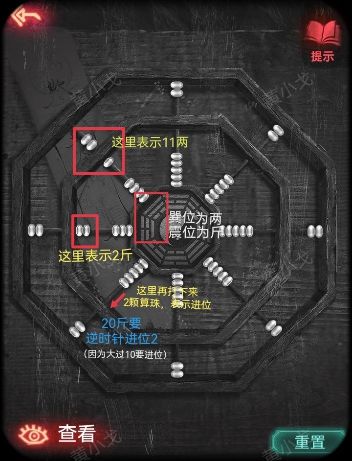 27.点击桌子上的算盘,根据[工坊]场景书上的线索和日记本上的线索,用算盘表示总数