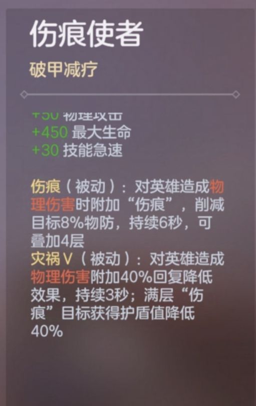 基础属性物攻,生命,冷却。被动效果伤痕,用连续多段的技能可以快速削减对面的物防。(这里区分一下,穿透和破防是只对个人操作的英雄有效,而物防削减可以使队友也吃到,性价比更高!)物防被削减后,敌方英雄会特别脆!特别脆!同时装备的减疗减盾词条直接克制所有英雄!让对面失去所有的力气和手段!![[表情_送花]](https://img.tapimg.com/market/images/68b3dc8473df915ad2b85da5efef4f56.png)