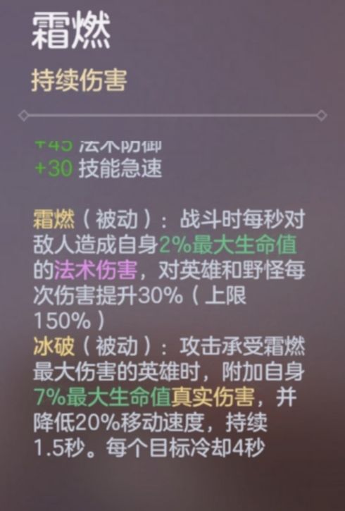 霜燃自带生命值,双抗和技能冷却,同时有持续叠加的范围伤害和普攻触发的真伤减速,是实实在在的战士万金油装备。(这里有一个小细节,冰破真伤不会立刻触发,而是要霜燃叠加5次才能解锁冰破,所以需要黏人能力比较强的英雄去贴脸5秒以上——多段位移的李靖就是一个例子)![[表情_酷]](https://img-tc.tapimg.com/market/images/edd50e702f508971043f5619f686740e.png)