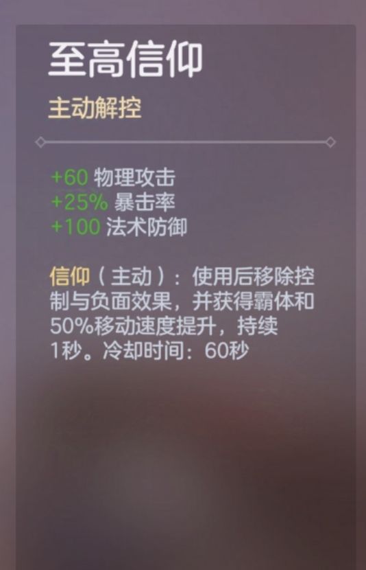 最后就是我们的老朋友了——至高信仰,解控加速和随缘暴击,很多英雄都少不了它!解控让操作更自信!让操作更丝滑!
