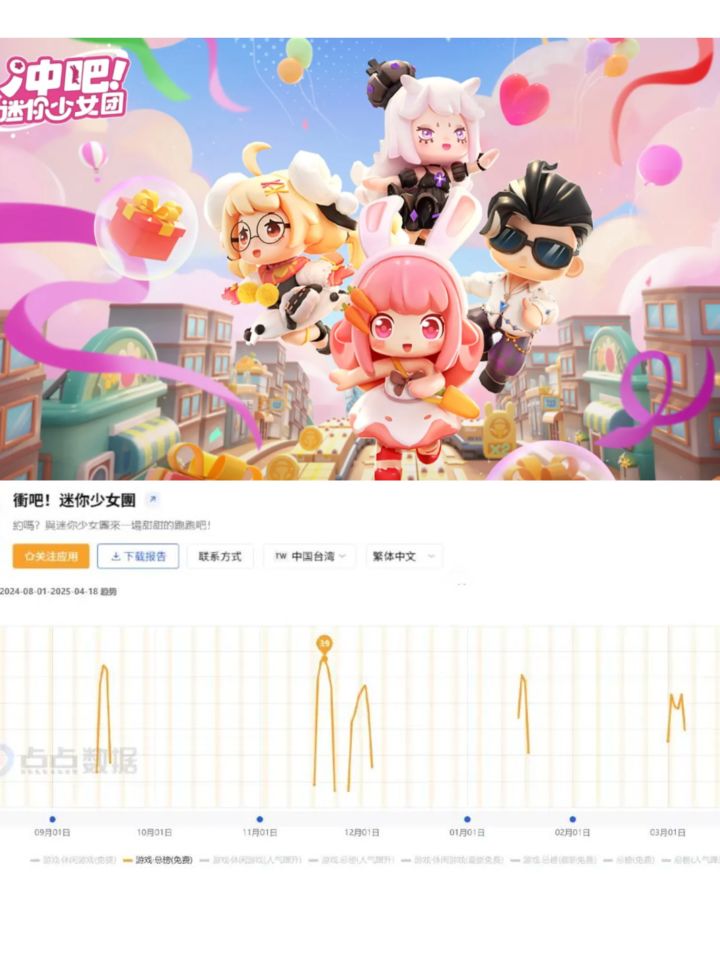 然而,项目说不上顺利。《冲吧!迷你少女团》去年9月份上线了台湾市场,但成绩并不理想。点点数据显示,游戏在上线初冲到了Google Play游戏免费榜第46名,后续最高曾抵达游戏免费榜第39名,而截至发稿日期,该游戏未进入过任一分类的畅销榜。