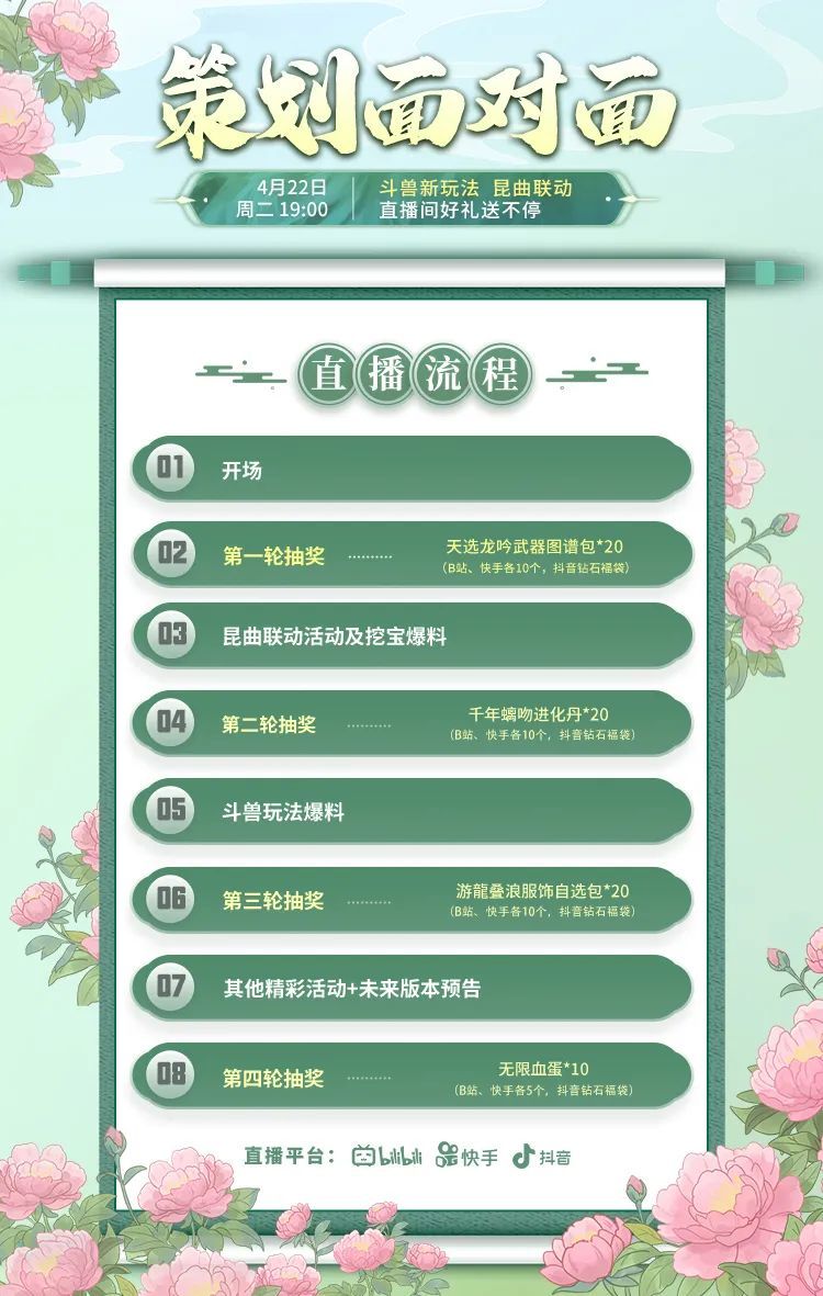 别急!在版本正式上线前,策划准备了一场干货满满的深度解读!4 月 22 日 19:00,锁定 B 站、抖音、快手三大平台官方直播间,跟着策划面对面畅聊新版本!无论是新玩法的决胜机制,还是联动背后的故事,这里全都有!