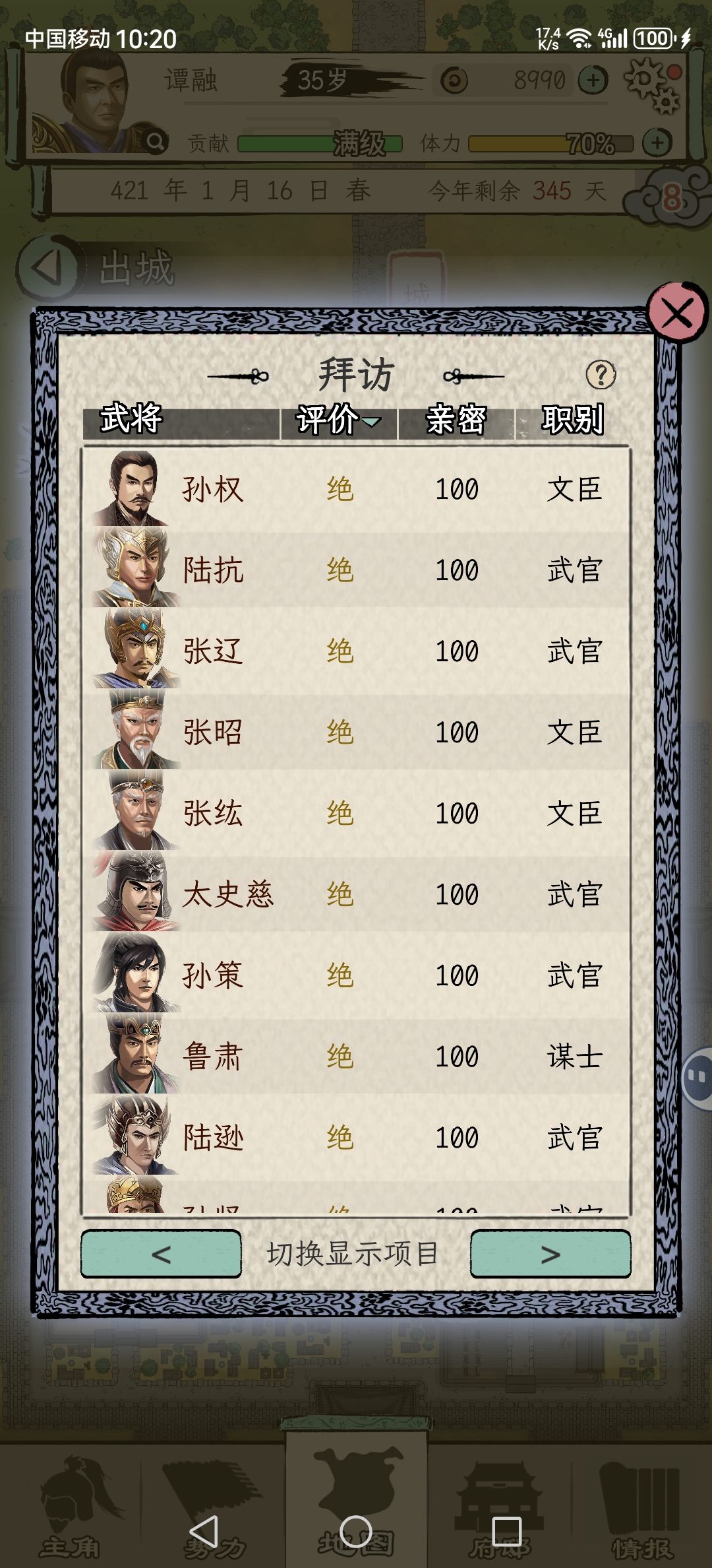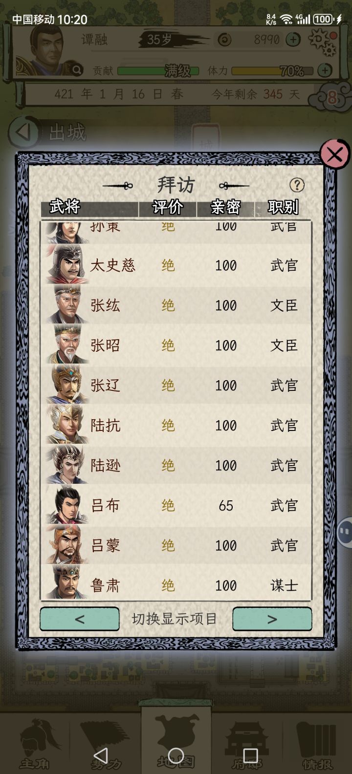 任务刷完 每年挑甲级评价以下的武将切磋 增加亲密度60以上就能成为同僚 同僚数量开局3个