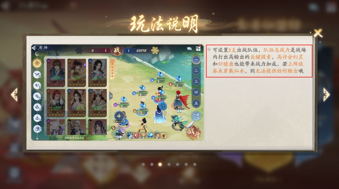 4、挑战准备期间,请家人们按战力上阵5队人马迎战boss,注意,所有上阵侠客,必须穿戴仙术,否则无法造成任何伤害,高评分幻灵和归墟盘能提供不错的战力加成,