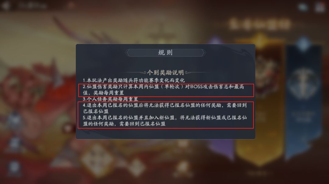 小贴士:如果个人玩家因自身原因,错失帮会统一攻打仙盟boss时间,可联系仙盟盟主/副盟主,在本周奖励结算前,为你单独开启一次仙盟boss,自己去打(帮会不统一打),玩家自己完成个人奖励任务和固定奖励