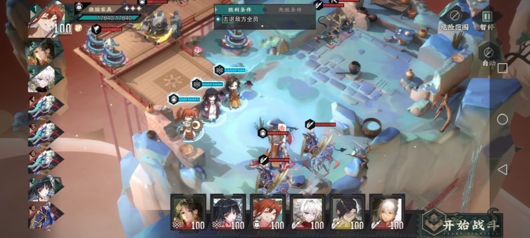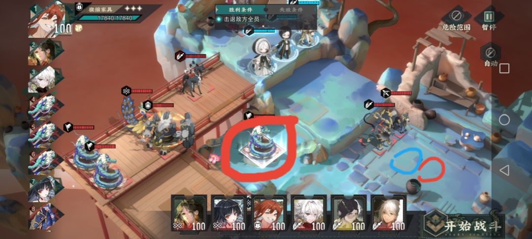 滴漏的第1次技能给到这个战略怪,然后往红色的圈走,雪王下来砍完之后在蓝色的圈那里,刚好可以卡住那只弓箭怪,剩下两只战略怪用商鞅的斩杀刀处理。