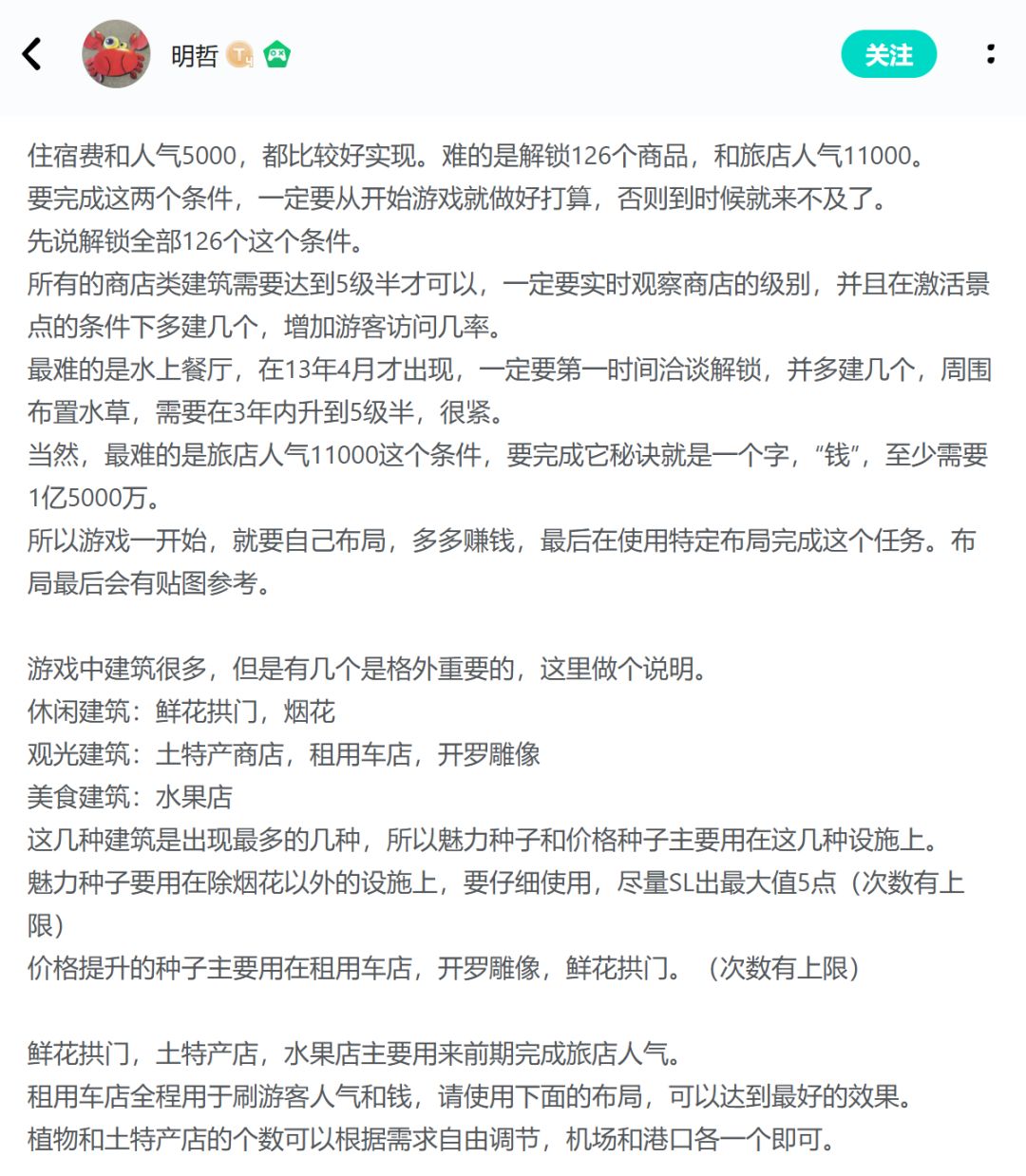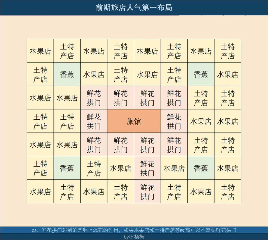 首先一号岛先简单建造一下,可以看上图,等二号岛出了先采用前期布局图。商店购买魅力种子不要随便使用,全部给到土特产店(30+)、水果店(40+)、鲜花拱门(40+),为二号图做准备,用来过s级旅店排名第一,过印章也非常方便。