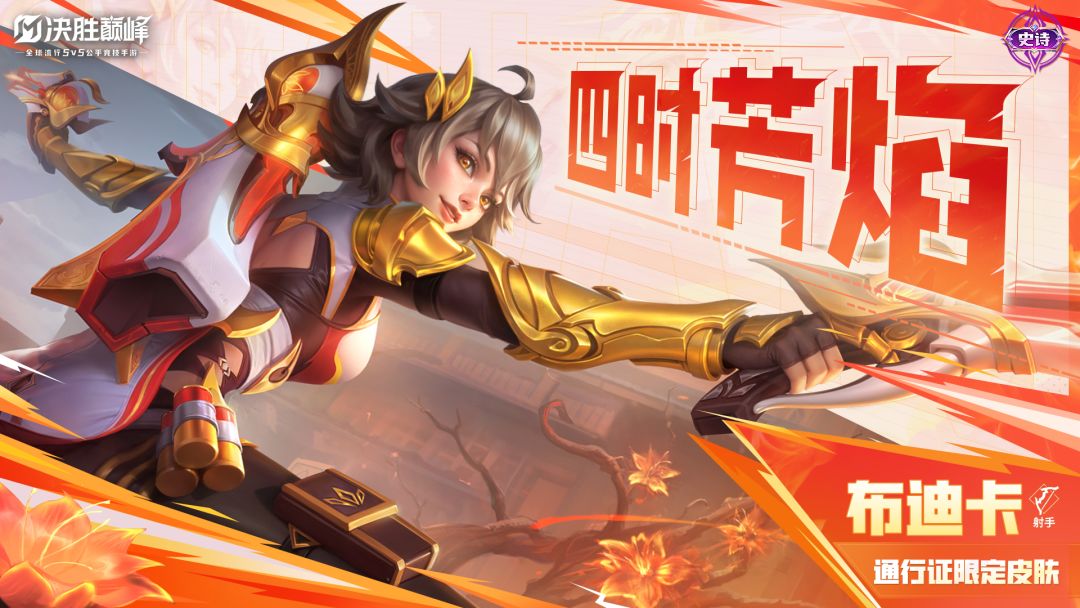 4月28日,布迪卡全新通行证史诗限定皮肤「四时芳焰」正式上线!花费366钻石解锁S2赛季通行证即可获取~一次购买,「无限续杯」,通过任务更可返还100%钻石,用于后续通行证购买,每期通行证都将包含3款精美皮肤和海量道具奖励哦!