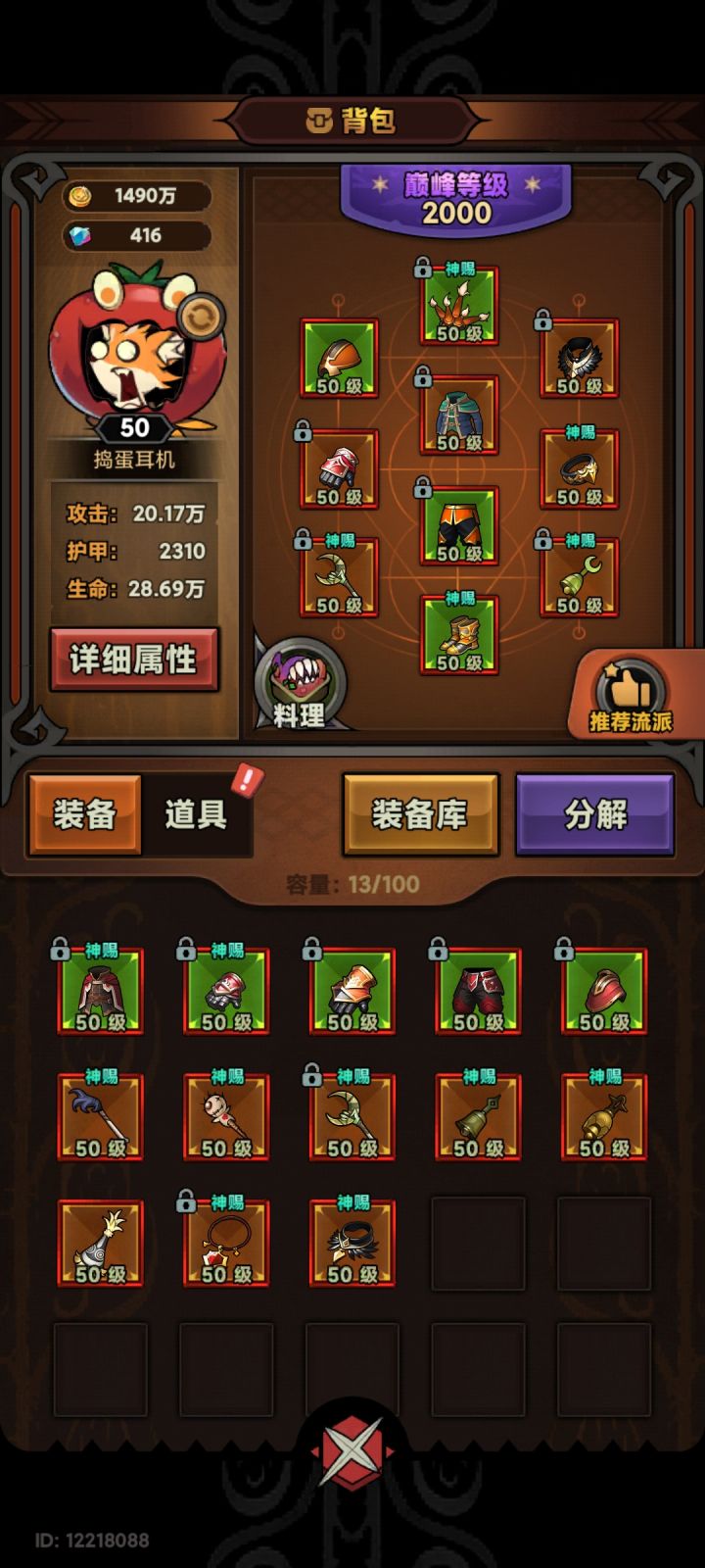 装备如图,没什么可讲的,防具共鸣稍微提一句,可选两个装备,其一是每吃一个血球提升7伤害的裤子,问题是持续时间太短,需要不停用料理制造血球,且开局伤害较低,需要较高熟练度掌握节奏,料理到cd就用,虽然麻烦且费料理,好处是不挑boss。