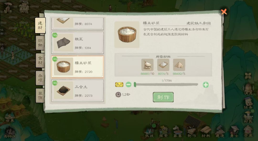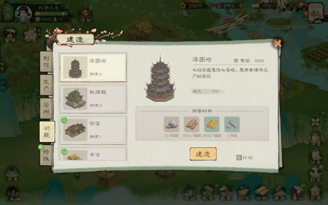 6、特殊资源的获取: (1)每个村子可建造一个伐木场花费铜币进行资源采取 (2)集市夜晚摊位商人处