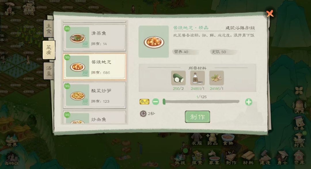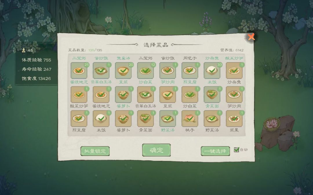 10 、家宴寿命经验获取 :选取高营养食物或菜品种类的丰富程度 (体质经验和寿命经验两个经验决定村民的寿命长短以及劳力
